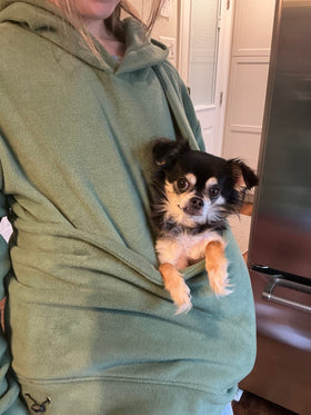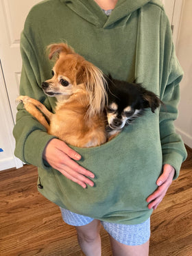 BeccaVerified BuyerThe perfect gift for pet lovers.My sweatshirt came today and I absolutely love it! I purchased a large,olive fleece. My little dog - an Minpin - is probably pushing the weight limit a little bit at 12 pounds but he adapted really quickly. Great for older dogs who need to be close when the fur parents are working from home! Within five minutes my Mick was relaxing and is already sound asleep and snoring away! Great product - lovely quality. thank you!